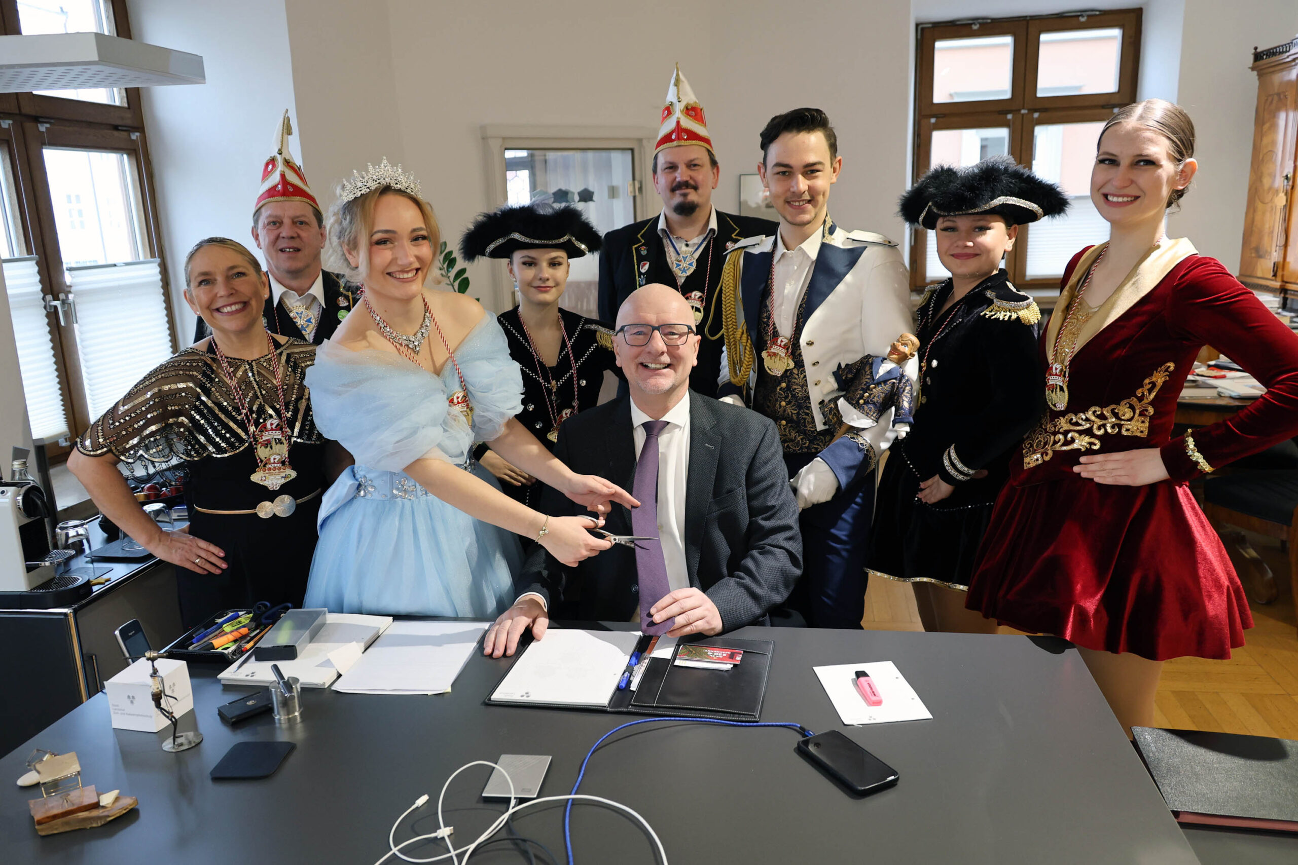 Zum „Unsinnigen Donnerstag“ kündigte sich im Büro von Oberbürgermeister Alexander Putz hoher närrischer Besuch an: Die Narrhalla Landshut zog mit Prinzenpaar und Gefolge ins Rathaus ein und übernahm das Kommando. Traditionell musste dabei die Krawatte des Rathauschefs „dran glauben“ – ein Brauch, dem sich der OB mit viel Humor stellte. Prinzessin Tiziana I. zückte die Schere, schnitt den Schlips in…