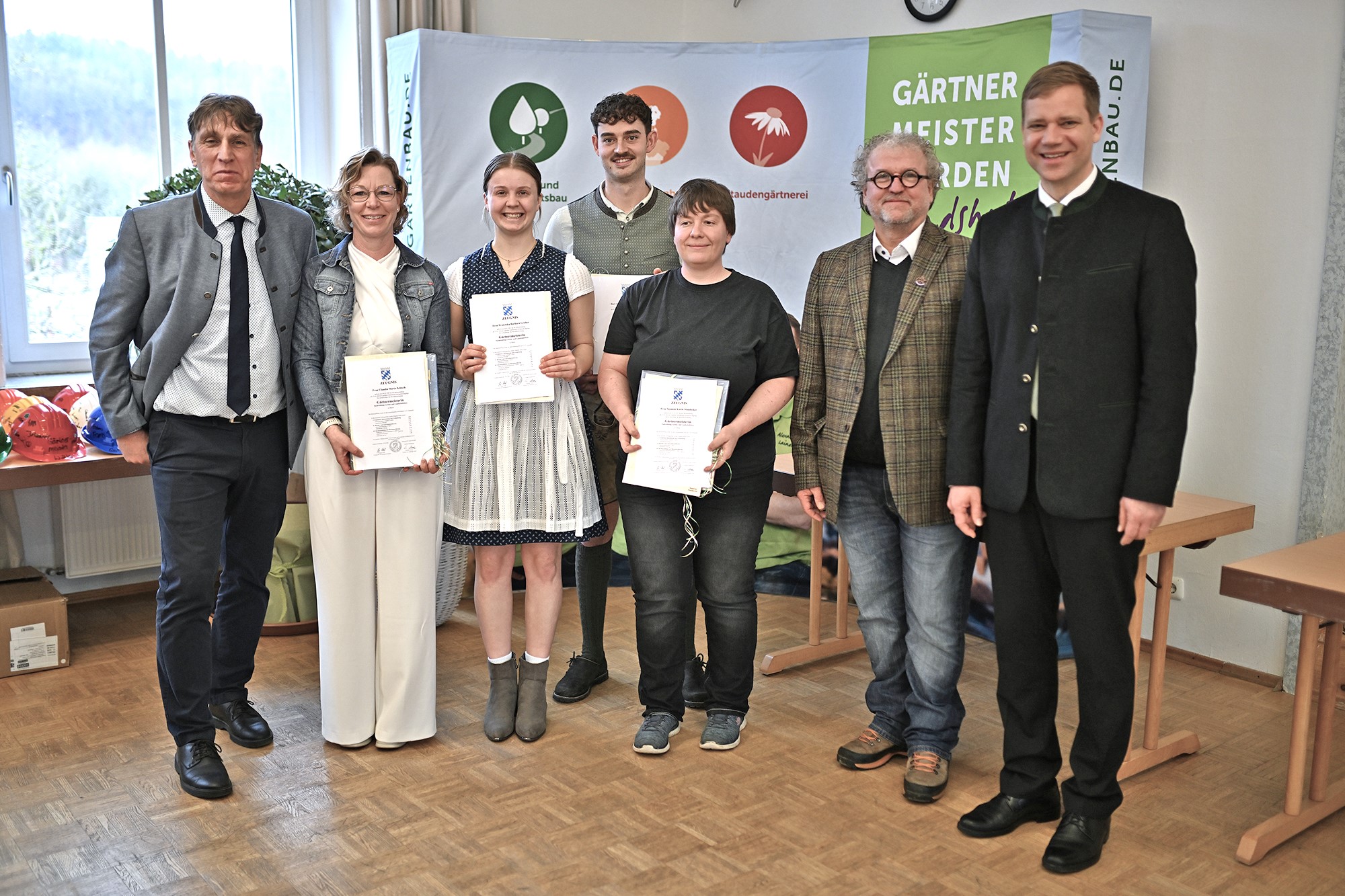 Michael Zehentbauer, Schulleiter der Fachschule für Gartenbau, Claudia Zebisch, Franziska Gruber, Elias Enzbrunner, Susanne Standecker, Percy Kostka vom Prüfungsausschuss und Bezirkstagspräsident Dr. Olaf Heinrich