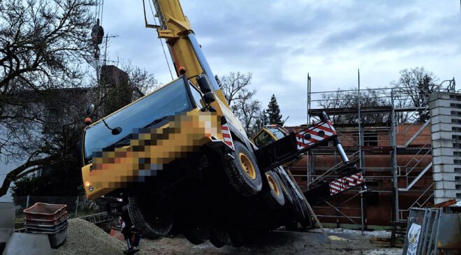 Anfängliche Meldungen, nach denen ein Kran umgestürzt sei, bestätigten sich glücklicherweise nicht. Die ersteintreffenden Kräfte fanden einen in Schieflage und mit weiten Teilen des Fahrzeugs in der Luft hängenden fünfachsigen Autokran vor, der Ausleger befand sich teilausgefahren in der Luft. Der Fahrer und das Baustellenpersonal konnten sich selbstständig in Sicherheit bringen.