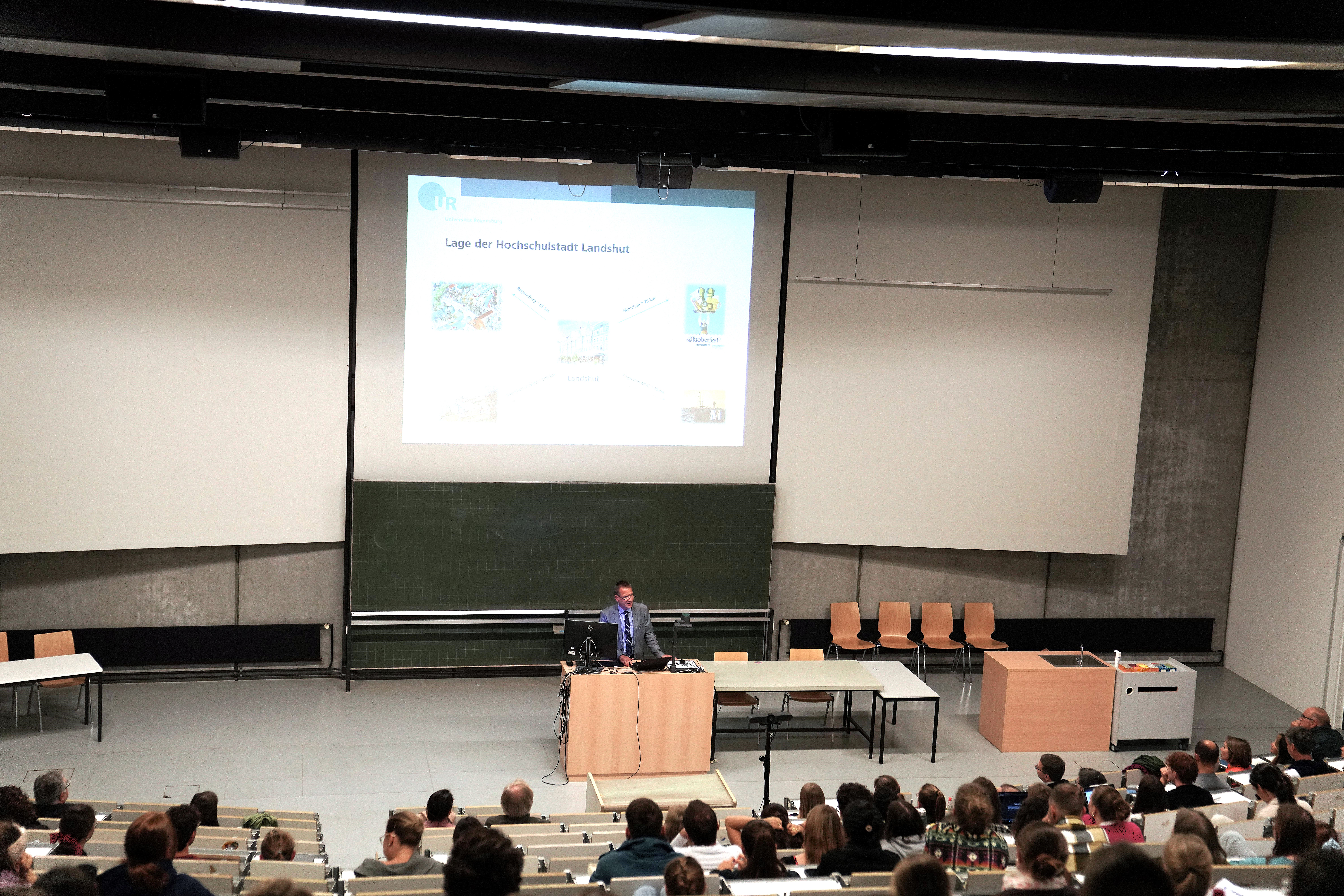 Prof. Schmidt präsentierte im Rahmen einer Infoveranstaltung rund 150 anwesenden Kollegen – zu denen der Vorstand der LAKUMED Kliniken die Studierenden kurzerhand erhob – jedoch nicht nur die Forschungs- und Versorgungsschwerpunkte des Klinikums Landshut, des Kinderkrankenhauses St. Marien und der LAKUMED Kliniken, sondern warb auch allgemein für den Standort und die Vorzüge der Dreihelmestadt. Zusammen mit Prof. Dr. Dr. Matthias Dollinger, Chefarzt der Medizinischen Klinik I am Klinikum Landshut, PD Dr. Lorenz Rieger, Chefarzt der Klinik für Gynäkologie und Geburtshilfe am Krankenhaus Landshut-Achdorf, und Wiebke Wallach, Koordinatorin für den MCN-Standort Landshut, stand jener ferner anschließend für die zahlreichen Fragen der Studierenden zur Verfügung und versicherte diesen umfangreiche Bemühungen hinsichtlich Wohnsituation, Sport- und Mobilitätsangebote, sowie sozialer Anbindung an die nach der Fusion fast 5.000 Mitarbeiter zählende Gemeinschaft der LA-Regio Kliniken.
