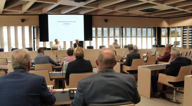 Ende September hat der Umzug begonnen, der erste Öffnungstag am 6. Oktober – der Betrieb der Landkreis-Verwaltung am neuen Standort nimmt immer mehr Fahrt auf. Die erste, wenn auch nichtöffentliche, Gremiensitzung im Großen Sitzungssaal des neuen Landratsamtes, gebührte dem Verwaltungsrat von LAKUBAU – dem Kommunalunternehmen des Landkreises, das dieses Großprojekt auf die Beine gestellt und durchgeführt hat.