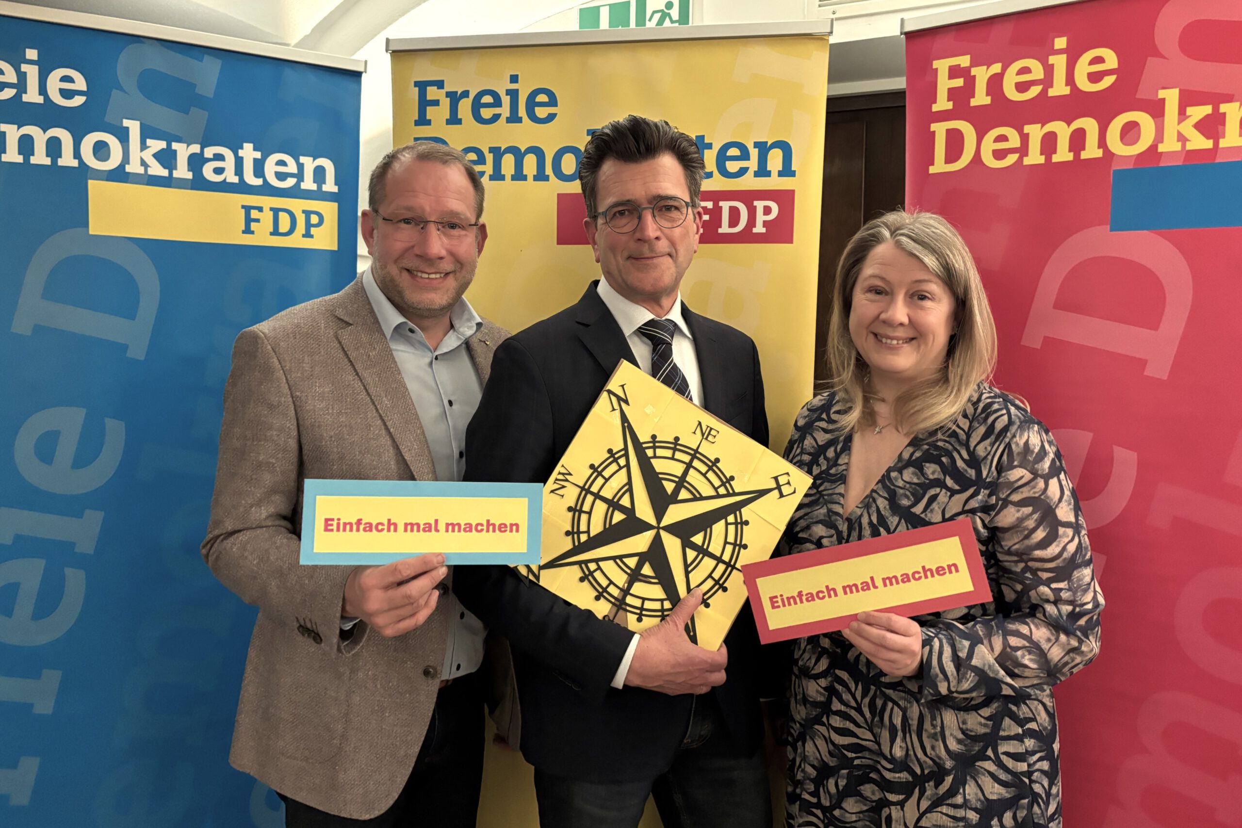 Im Anschluss an seine Rede überreichten FDP-Stadträtin Kirstin Sauter und Kreisvorsitzender Frank Schräder einen Kompass als Symbol für liberale Politik, die Orientierung gibt, ohne einzuengen. Er steht für den Anspruch, der Stadt eine klare Richtung zu geben und gleichzeitig den Menschen die Freiheit zu lassen, ihren eigenen Weg zu gehen.