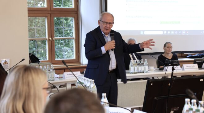 Als Referent konnte Dr. Eugen Ehmann, Jurist, ehemaliger Regierungspräsident von Unterfranken und Autor des Fachratgebers „Obdachlosigkeit in Kommunen“, gewonnen werden. Er beleuchtete in seinem Vortrag eine Vielzahl praxisrelevanter Themen – vom erstmaligen Kontakt mit obdachlosen Personen über Zuständigkeiten der Gemeinden bis hin zu Fragen der Unterbringung, Wiedereinweisung und Kostenerstattung. Auch Aspekte wie der Vorrang der Selbsthilfe, Maßnahmen bei drohender Zwangsräumung sowie die Mindestanforderungen an kommunale Unterkünfte wurden ausführlich behandelt.
