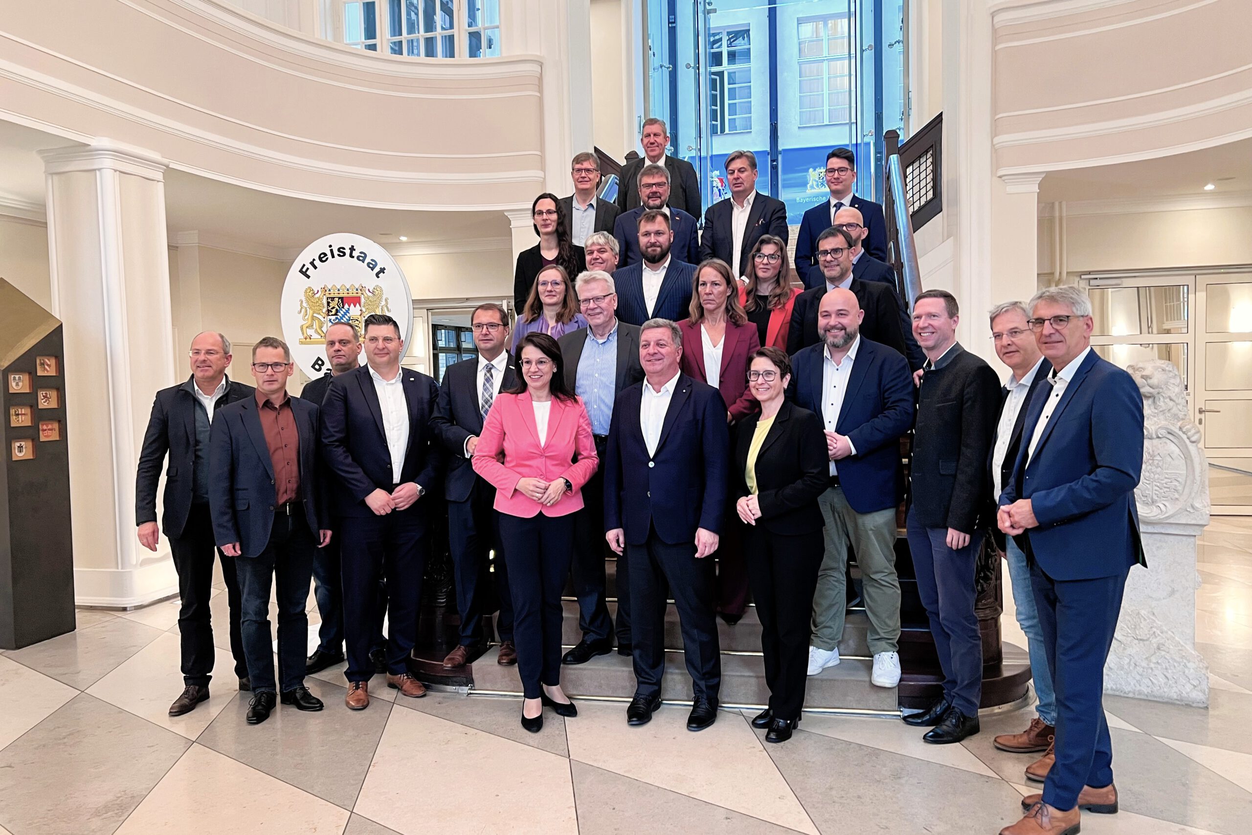 Bayerns Verkehrsminister Christian Bernreiter (vorne Mitte) diskutierte mit Vertreterinnen und Vertretern aus der Region und der Branche über die Zukunft der Franken-Sachsen-Magistrale.
