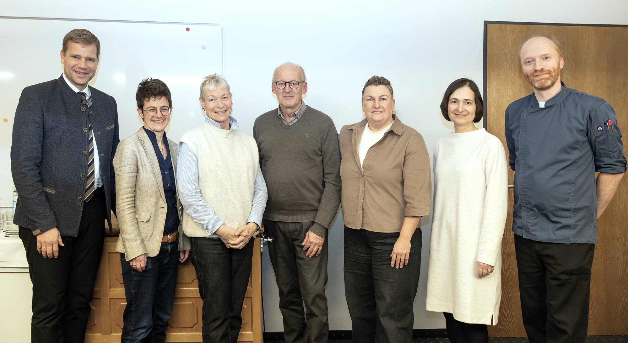 Im Bild (v. l.): Bezirkstagspräsident Dr. Olaf Heinrich, Katrin Obermeier, persönliche Referentin des Bezirkstagspräsidenten, Dorothee Trauzettel, Amt für Ernährung, Landwirtschaft und Forsten, Günther Putz, Leiter Gutshof Mainkofen, Margit Huber, Leiterin der Kantine am ABZ, Hildegard Zißler, Verpflegungsleiterin am IfH Straubing, und Benjamin Hepperle, Verpflegungsleiter am BKM