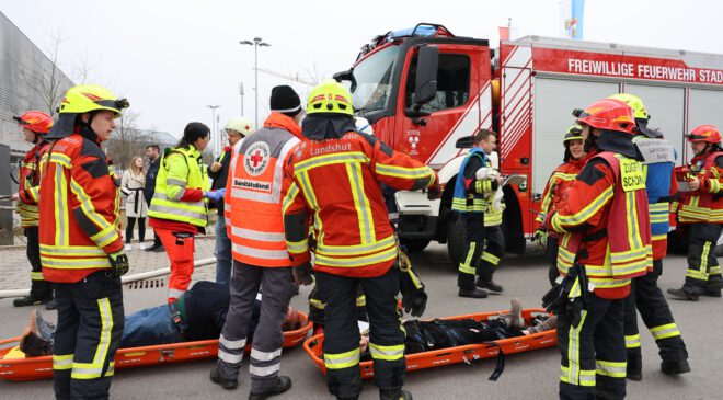Entworfen wurde die Übung, an der rund 350 größtenteils ehrenamtliche Einsatzkräfte und Freiwillige teilnahmen, von Thomas Schindler mit seinem Team und Stadtbrandrat Sebastian Öllerer: „Um im Ernstfall gerüstet zu sein und schnell zu reagieren“, wie der Katastrophenschutzleiter betonte. Für eine möglichst realitätsnahe Simulation sorgten über 50 Laiendarsteller, die entsprechend geschminkt wurden, sowie ein (umweltverträgliches) Farbpulver, das die Isar zeitweise grün färbte. Im Übungsszenario schob der verunglückte Heizöltanker den Bus gegen den Seiteneingang der Eishalle – die Folge: Rauchentwicklung im Bus und im Stadion. Die Besucher eines fiktiven Eishockeyspiels mussten schnellstmöglich evakuiert werden. Der Zeitfaktor, das Schadensszenario vor Ort wie auch der Massenanfall an Verletzten waren Herausforderungen, die eine koordinierte Zusammenarbeit aller Einsatzkräfte, die Hand in Hand geht, umso mehr unter Beweis stellten.
