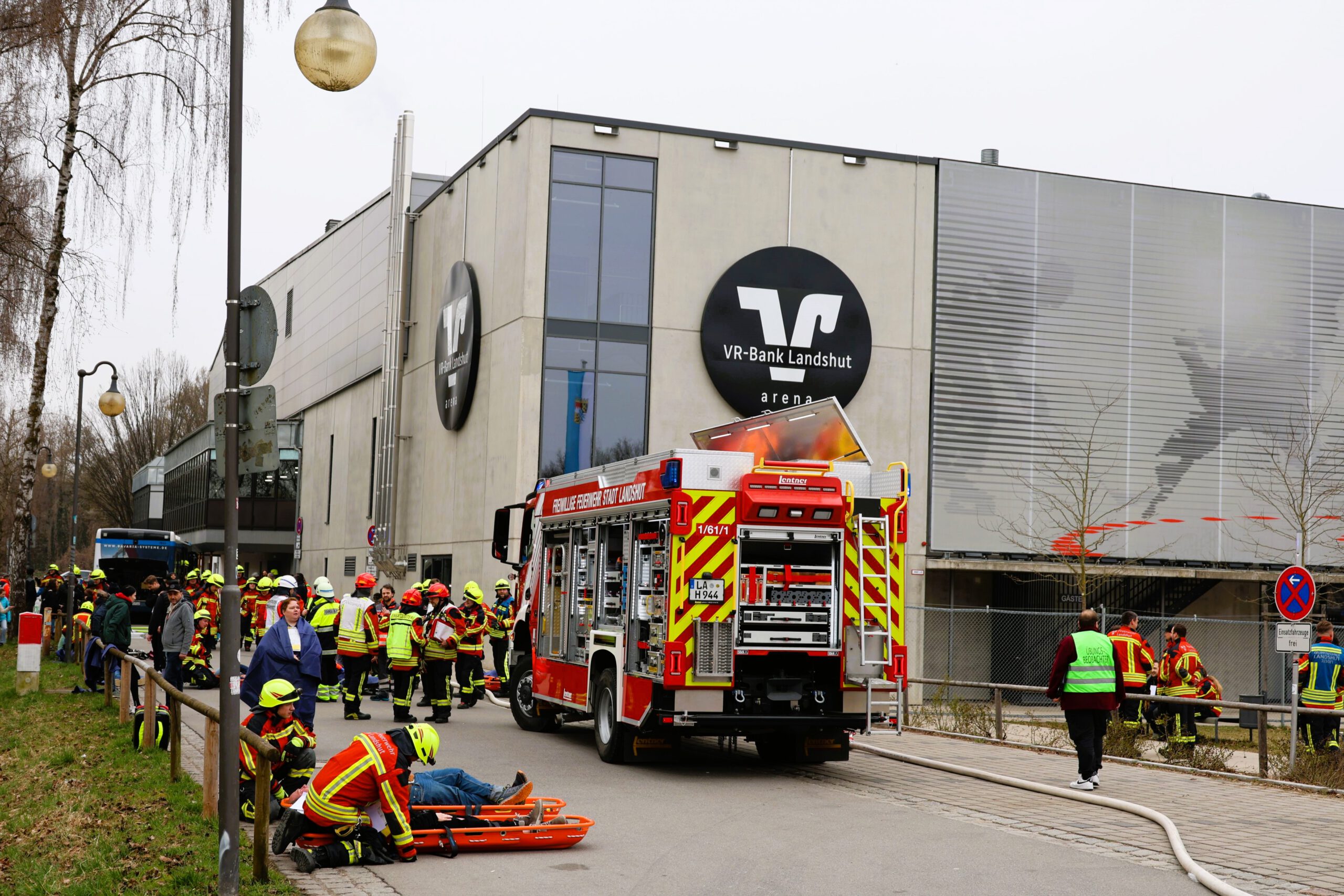 Entworfen wurde die Übung, an der rund 350 größtenteils ehrenamtliche Einsatzkräfte und Freiwillige teilnahmen, von Thomas Schindler mit seinem Team und Stadtbrandrat Sebastian Öllerer: „Um im Ernstfall gerüstet zu sein und schnell zu reagieren“, wie der Katastrophenschutzleiter betonte. Für eine möglichst realitätsnahe Simulation sorgten über 50 Laiendarsteller, die entsprechend geschminkt wurden, sowie ein (umweltverträgliches) Farbpulver, das die Isar zeitweise grün färbte. Im Übungsszenario schob der verunglückte Heizöltanker den Bus gegen den Seiteneingang der Eishalle – die Folge: Rauchentwicklung im Bus und im Stadion. Die Besucher eines fiktiven Eishockeyspiels mussten schnellstmöglich evakuiert werden. Der Zeitfaktor, das Schadensszenario vor Ort wie auch der Massenanfall an Verletzten waren Herausforderungen, die eine koordinierte Zusammenarbeit aller Einsatzkräfte, die Hand in Hand geht, umso mehr unter Beweis stellten.