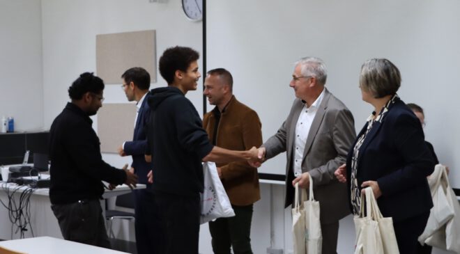 Zum Abschluss des offiziellen Teils überreichten Bürgermeister und Landrat gemeinsam Welcome-Taschen an die neuen Studierenden. Ein besonderer Programmpunkt war die Führung durch die Lern- und Musterfabrik des TZ PULS, geleitet von Prof. Dr. Martin Prasch, dem Studiengangsleiter von SIOB. Dabei erhielten die Studierenden einen ersten praktischen Einblick in die Arbeitsweise des Zentrums.