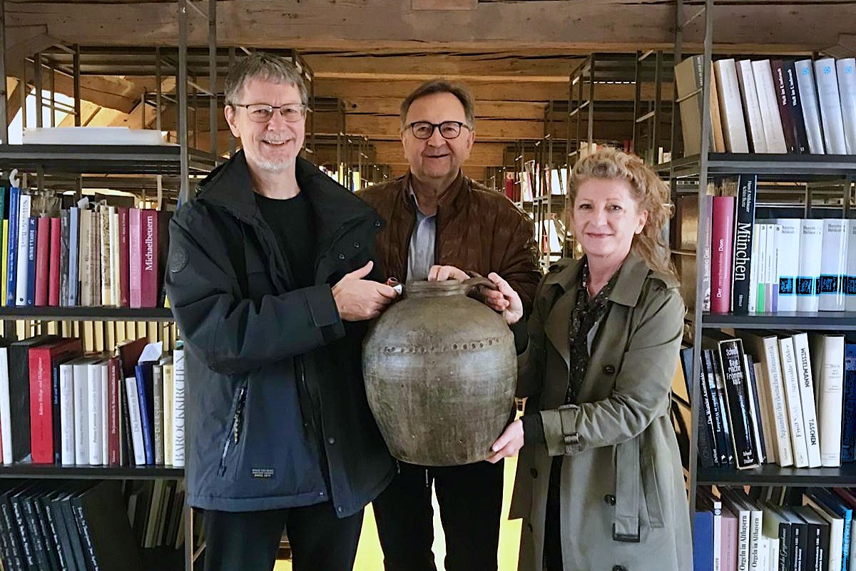 Bildbeschreibung (v.l.n.r.): Max Tewes, Rudolf Schnur und Anke Humpeneder-Graf bei der Übergabe des Doppelhenkelkrugs im Obergeschoß des LANDSHUTmuseums.