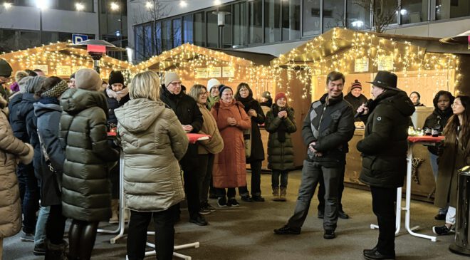 Doch überwog an den Abenden der LAKUMED Weihnachtsfeiern allen Herausforderungen und anstehenden Veränderungen zum Trotz die festliche Stimmung, die aufgrund der lukullischen Genüsse aus der Küche, adventlichen Gedanken der Krankenhaus-Seelsorger oder den zwischenmenschlichen Zusammenkünften die zahlreichen Besucher umgab. Besinnliche Worte zur Einstimmung auf das Weihnachtsfest, das neue Jahr und die anstehende Ära richteten dabei in Landshut-Achdorf auch Ärztlicher Direktor Gunthard Goresch, Vorstand Prof. Dr. Johannes Schmidt, in Vilsbiburg Bürgermeisterin Sibylle Entwistle und Ärztlicher Direktor Dr. Raimund Busley, sowie in Rottenburg Bürgermeister Alfred Holzner an die Beschäftigten. An der Schlossklinik Rottenburg wurde die Feier zudem von der O’Seitl Musi umrahmt. Während sich die Weihnachtsfeiern 2025 in Landshut-Achdorf und Rottenburg im typischen Gewand präsentierten, wagten die Verantwortlichen in Vilsbiburg eine gelungene Umgestaltung: Zwischen mehreren Essenständen, Lichterketten und Weihnachtsmusik entstand im Innenhof des Krankenhauses Vilsbiburg erstmals ein atmosphärischer Weihnachtsmarkt, der im Gegensatz zu den verfügbaren Räumlichkeiten allen interessierten Mitarbeitern des Standortes eine vorweihnachtliche Herberge schenkte.
