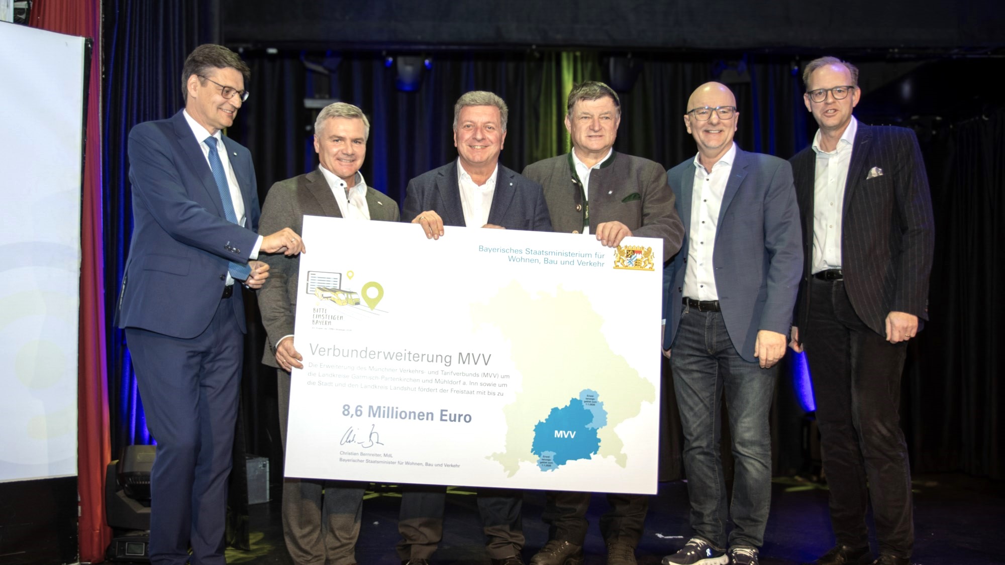 Bildbeschreibung: Bayerns Verkehrsminister Christian Bernreiter überreicht den neuen MVV-Gesellschaftern symbolisch ihren Förderbescheid.