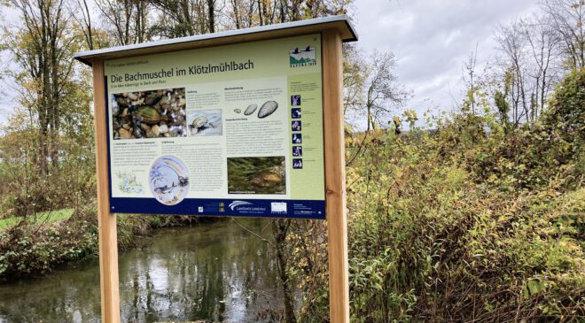 Um die Bachmuschel und ihren Wert für die Umwelt bekannter zu machen, wurden entlang des Klötzlmühlbachs neue Infotafeln aufgestellt – beispielsweise beim Sportplatz in der Münchnerau. Sie informieren die Spaziergänger über die Biologie, Lebensweise und Gefährdung der Bachmuschel. „Wir wollen den Menschen zeigen, welch wertvolle Schätze in unseren Bächen leben – oft völlig unbemerkt“, sagt Gebietsbetreuer Fabian Hertrich. Die Tafeln wurden von der Gebietsbetreuung Landshut gemeinsam mit der Stadt und dem Landkreis Landshut entwickelt und über die Regierung von Niederbayern finanziert.