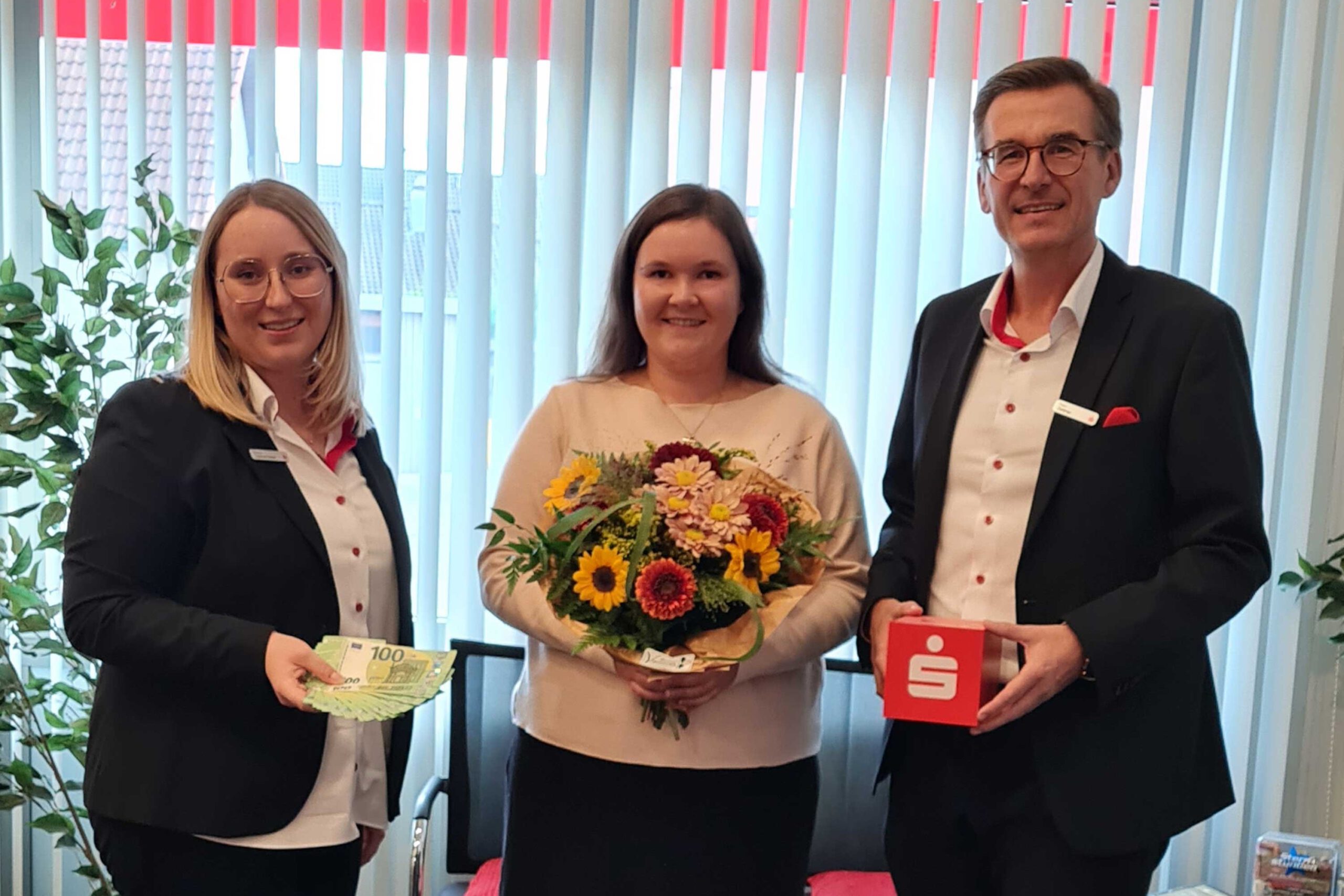 Geschäftsstellenleiterin Helena Lackermeier und Regionaldirektor Franz Zellmer überreichten den Gewinn mit vielen Glückwünschen.