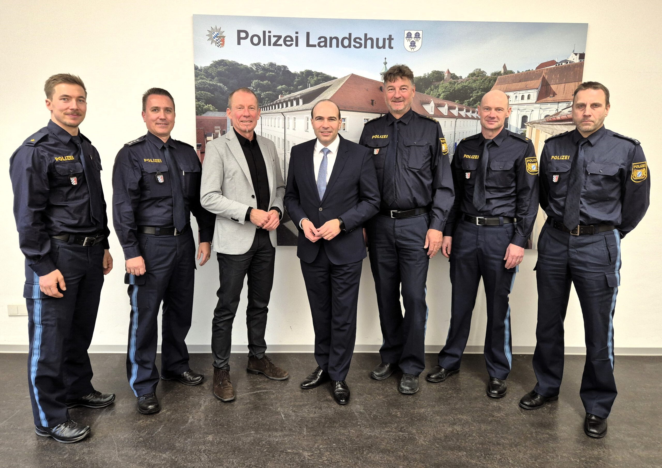 Bildunterschrift: Floria Oßner MdB (Mitte) informierte sich bei PI-Leiter Peter Böttinger (3.v.r) und seinen Kollegen über die aktuellen Herausforderungen der Landshuter Polizei und sicherte seine Unterstützung zu.