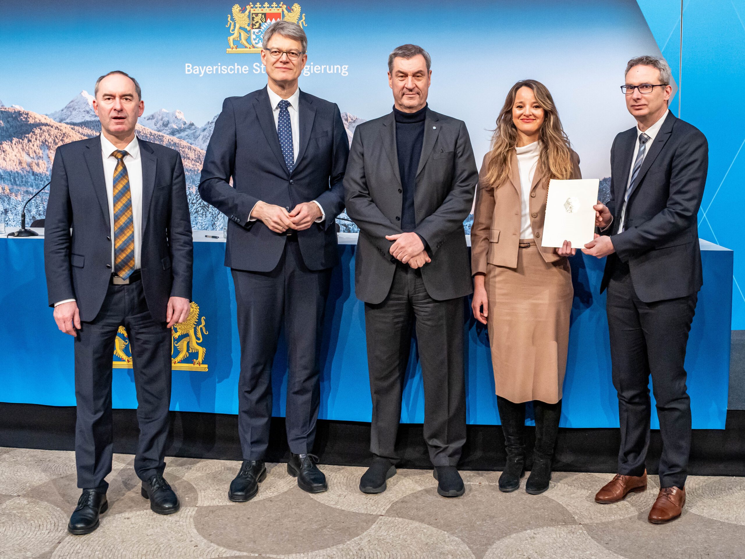 Übergabe des Förderbescheids an die Hochschule Landshut (v. l. n. r.): Staatsminister Hubert Aiwanger, Bundesverkehrsminister Patrick Schnieder, Ministerpräsident Dr. Markus Söder, Prof. Dr. Aida Anetsberger, Vizepräsidentin Forschung und wissenschaftlicher Nachwuchs der Hochschule Landshut, Prof. Dr. Tim Rödiger, Projektkoordinator auf Seiten der Hochschule Landshut