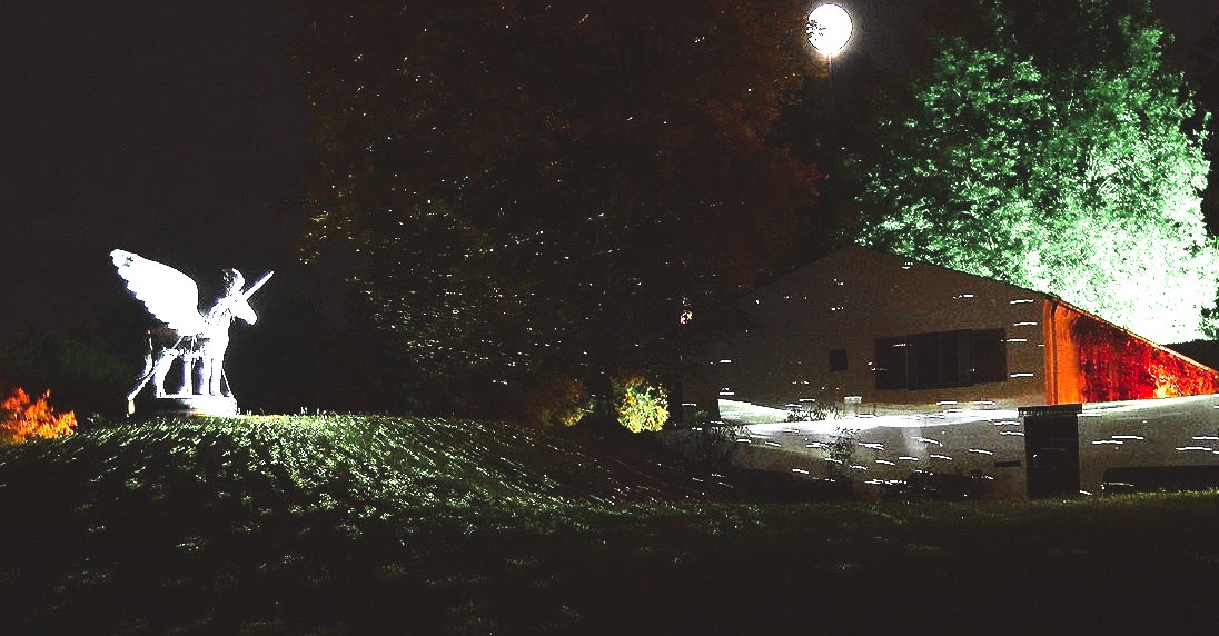 Auf dem Weg zum Wohnhaus und Atelier platziert Torsten Mühlbach sein verspiegeltes „Pegasus-Einhorn“ auf dem angestammten Platz von Fritz Koenigs „Pferdemensch“ und bringt den gesamten Berg zum Funkeln.