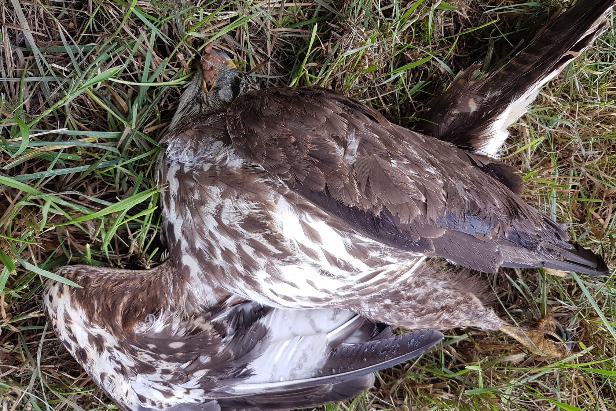 Vergifteter Mäusebussard mit Köder