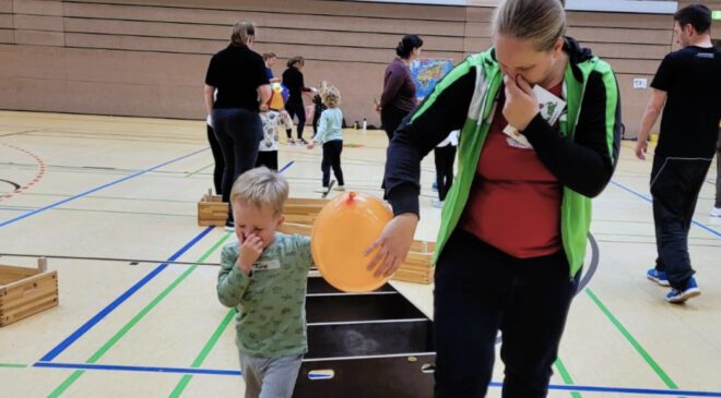 „Mama, pass auf. Ein Schritt darüber, jetzt zwei Schritt vorwärts“. Beim Maulwurf-Parcours muss man gut lotsen. Denn schließlich ist der Maulwurf ja blind. Seinen Weg findet er, indem der Partner ihm zuruft. Beim Kinderturntag des ETSV09 Landshut waren Mama, Papa und Kind Partner. Jeder begab sich einmal in die Rolle des kurzsichtigen Buddel-Tieres. Für viele Eltern ein ungewohntes Gefühl, sich dem eigenen Nachwuchs anzuvertrauen.