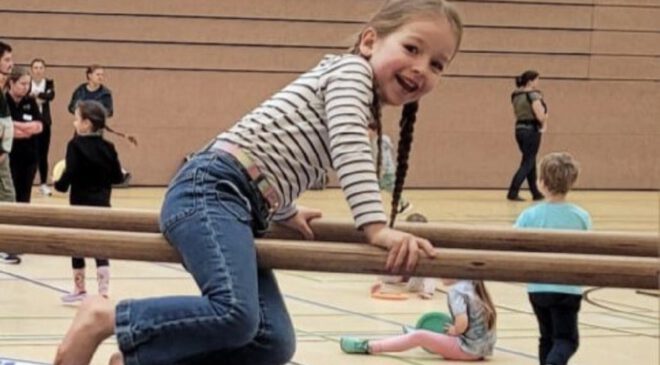 Zuvor hatten sich die Familien in Kennenlern-Spielen miteinander vertraut gemacht, sodass eine schöne Gemeinschaft entstand: „Besonders hat mich gefreut, dass Mütter und Väter unterschiedlichster Herkunft zueinander gefunden haben: aus der näheren Umgebung, aus dem Landkreis, aus anderen Bundesländern und aus Ost- und Südosteuropa“, berichtet Kerstin Schedlbauer, die Initiatorin des Kinderturntags bei der 09. Denn genau das ist das Ziel des „Sport-Treff Extra“, der nicht nur am Kinderturntag stattfindet. In regelmäßigen Abständen jeweils am Samstag steht dieses niederschwellige Familien-Bewegungsangebot allen neu Zugezogenen und Nachbarn offen.