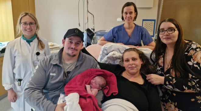 Funktionsoberärztin Dr. med. Ellen Bauer, Hebamme Antonia von Soden und die stolzen Eltern Marwin Neigert und Madlin Bäcker mit Baby Liana Neigert sowie deren Tante Cindy Bäcker.